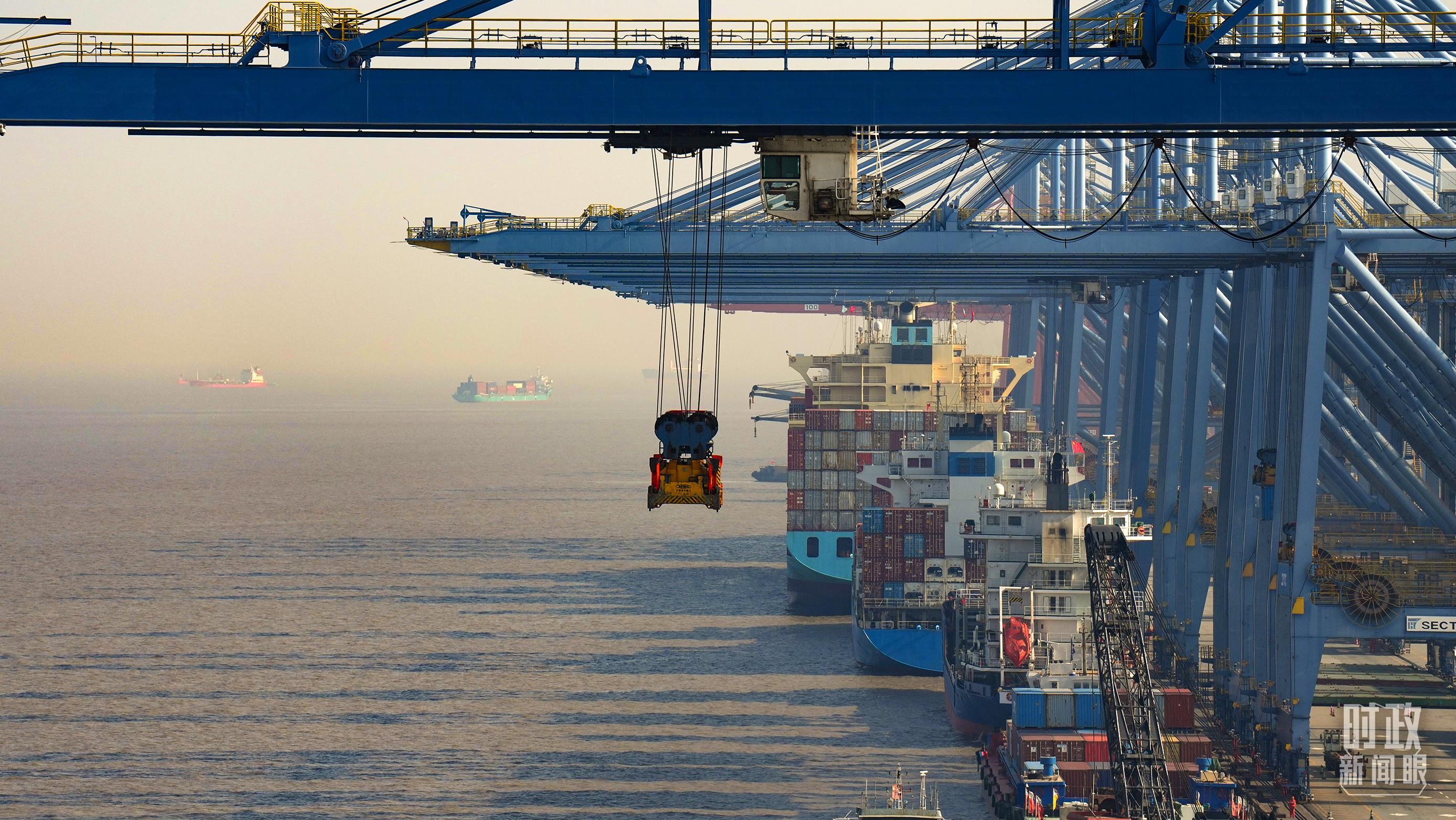 △上港集箱外高橋碼頭,巨型塔吊正在吊裝集裝箱貨柜。(總臺(tái)國(guó)廣記者李晉拍攝)