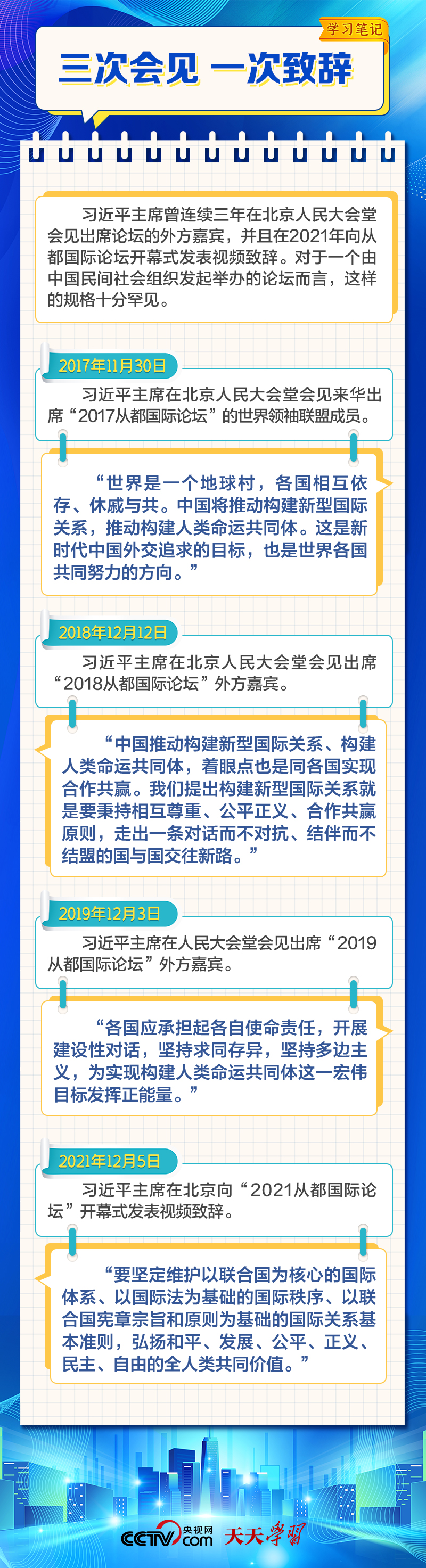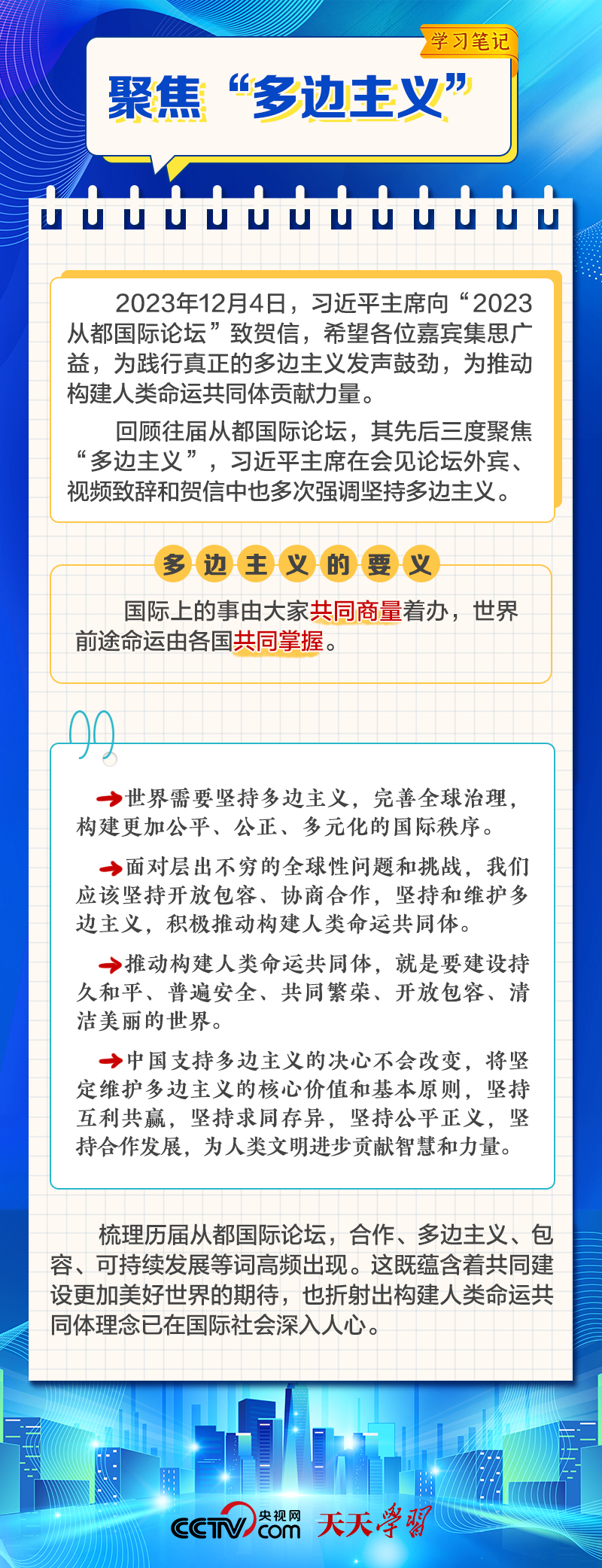 天天學(xué)習(xí)12月4日,習(xí)近平主席在致“2023從都國際論壇”的賀信中強調(diào),面對前所未有的世界之變、時代之變和歷史之變,人類社會必須團結(jié)起來,堅持互學(xué)互鑒、開放包容、合作共贏,弘揚全人類共同價值,共同建設(shè)更加美好的世界。