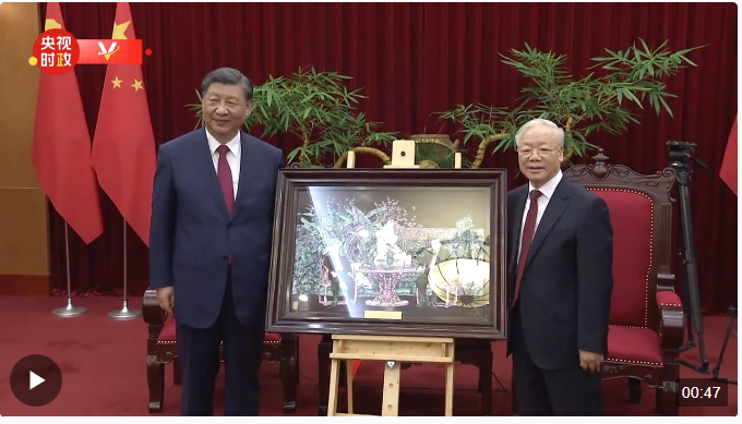 當(dāng)?shù)貢r(shí)間12月12日下午,剛剛抵達(dá)河內(nèi)的中共中央總書記、國(guó)家主席習(xí)近平在越共中央駐地同越共中央總書記阮富仲舉行會(huì)談。會(huì)談后,阮富仲邀請(qǐng)習(xí)近平進(jìn)行小范圍茶敘。兩黨總書記在輕松友好的氛圍中繼續(xù)進(jìn)行深入溝通。
