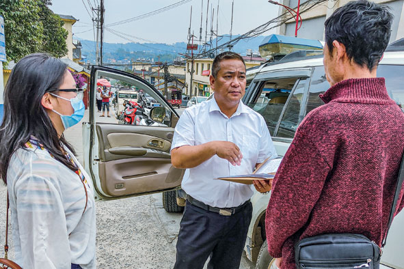 鮑衛(wèi)忠(中)在云南省臨滄市滄源佤族自治縣勐角傣族彝族拉祜族鄉(xiāng)農(nóng)貿(mào)市場(chǎng)附近和案件當(dāng)事人了解情況(2021年4月2日攝)。新華社發(fā)