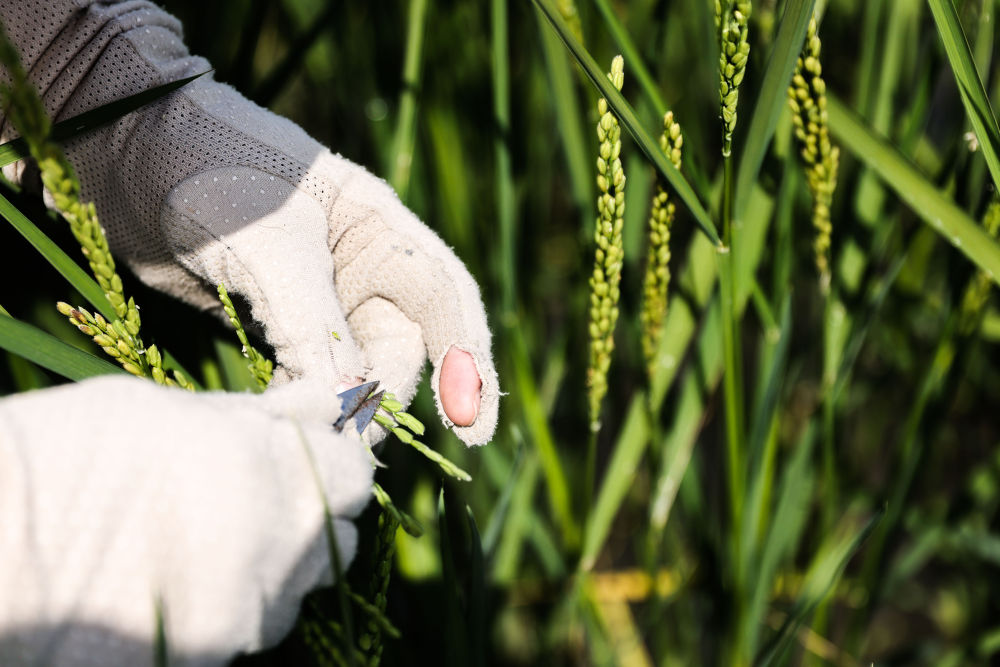 2023年2月22日,青島海水稻研究發(fā)展中心的科研人員于萌在三亞的國家南繁科研育種基地里做水稻雜交實驗。新華社記者 張麗蕓 攝