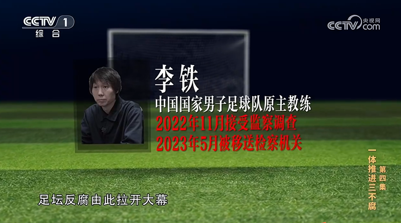 【解說詞】李鐵是本次專案第一個(gè)接受監(jiān)察調(diào)查并被留置的人員,事實(shí)證明,這個(gè)切入點(diǎn)的選擇是非常精準(zhǔn)的。他既在多家俱樂部擔(dān)任過教練,又曾擔(dān)任中國國家男子足球隊(duì)主教練,在足球領(lǐng)域關(guān)系盤根錯(cuò)節(jié),以他為突破口縱深挖掘、橫向拓展,牽出了從聯(lián)賽到國家隊(duì)、從俱樂部到足協(xié)的若干涉嫌違紀(jì)違法犯罪人員,以及種種黑幕和制度漏洞。
