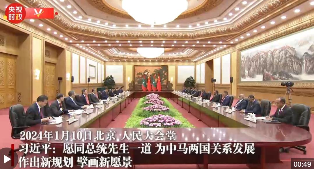 1月10日下午,國家主席習(xí)近平在人民大會(huì)堂同來華進(jìn)行國事訪問的馬爾代夫總統(tǒng)穆伊茲舉行會(huì)談。