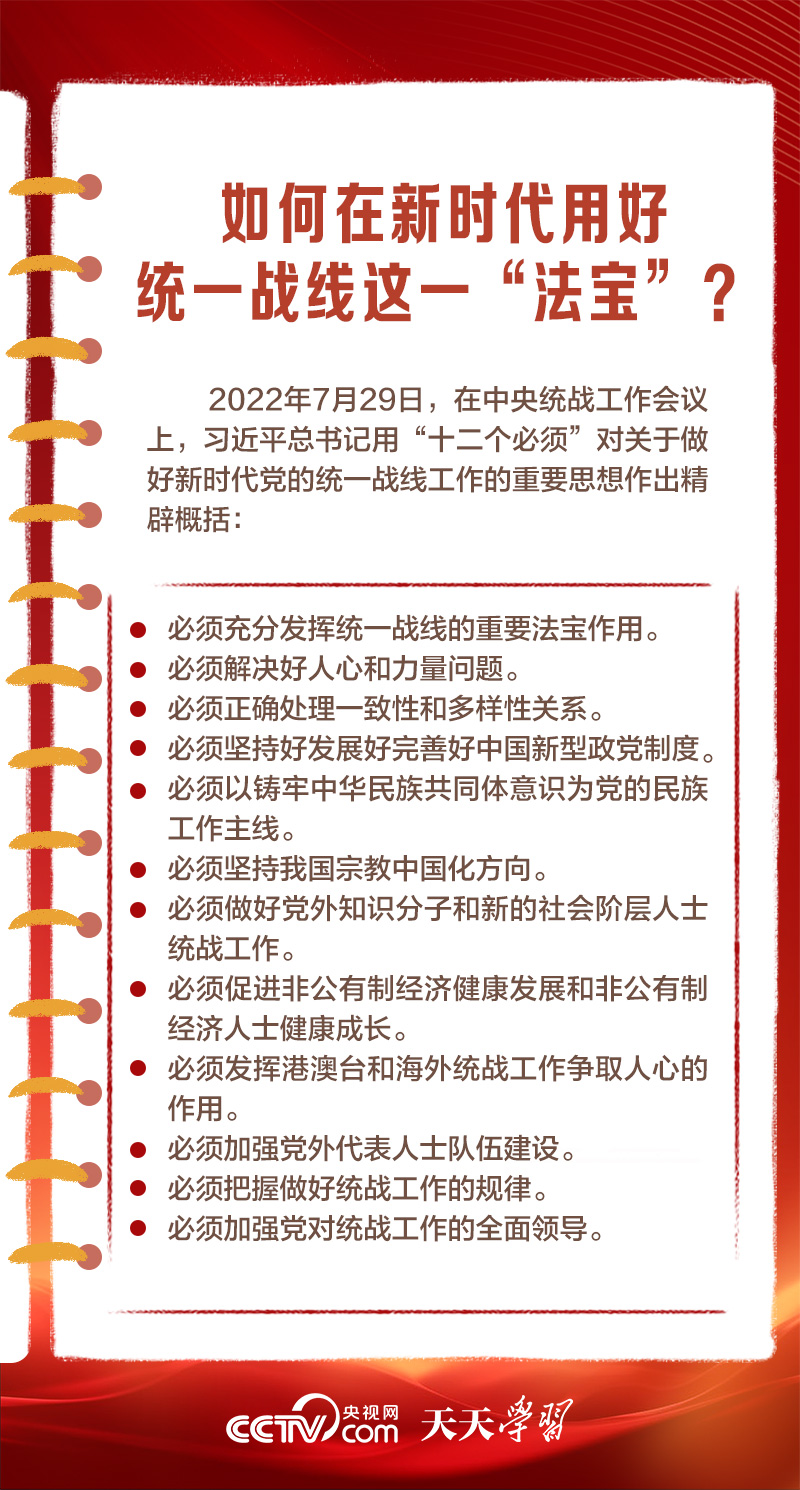 天天學(xué)習(xí)1月16日出版的第2期《求是》雜志發(fā)表了習(xí)近平總書記的重要文章《完整、準(zhǔn)確、全面貫徹落實(shí)關(guān)于做好新時代黨的統(tǒng)一戰(zhàn)線工作的重要思想》,該文是習(xí)近平總書記2022年7月在中央統(tǒng)戰(zhàn)工作會議上講話的一部分。文章指出,統(tǒng)一戰(zhàn)線是黨克敵制勝、執(zhí)政興國的重要法寶,是團(tuán)結(jié)海內(nèi)外全體中華兒女實(shí)現(xiàn)中華民族偉大復(fù)興的重要法寶,必須長期堅(jiān)持。
