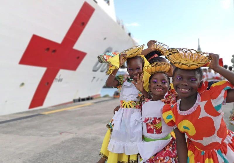 △2018年10月,在安提瓜和巴布達首都圣約翰,當?shù)匦∨笥焉泶﹤鹘y(tǒng)服裝歡迎中國海軍“和平方舟”醫(yī)院船首次到訪。