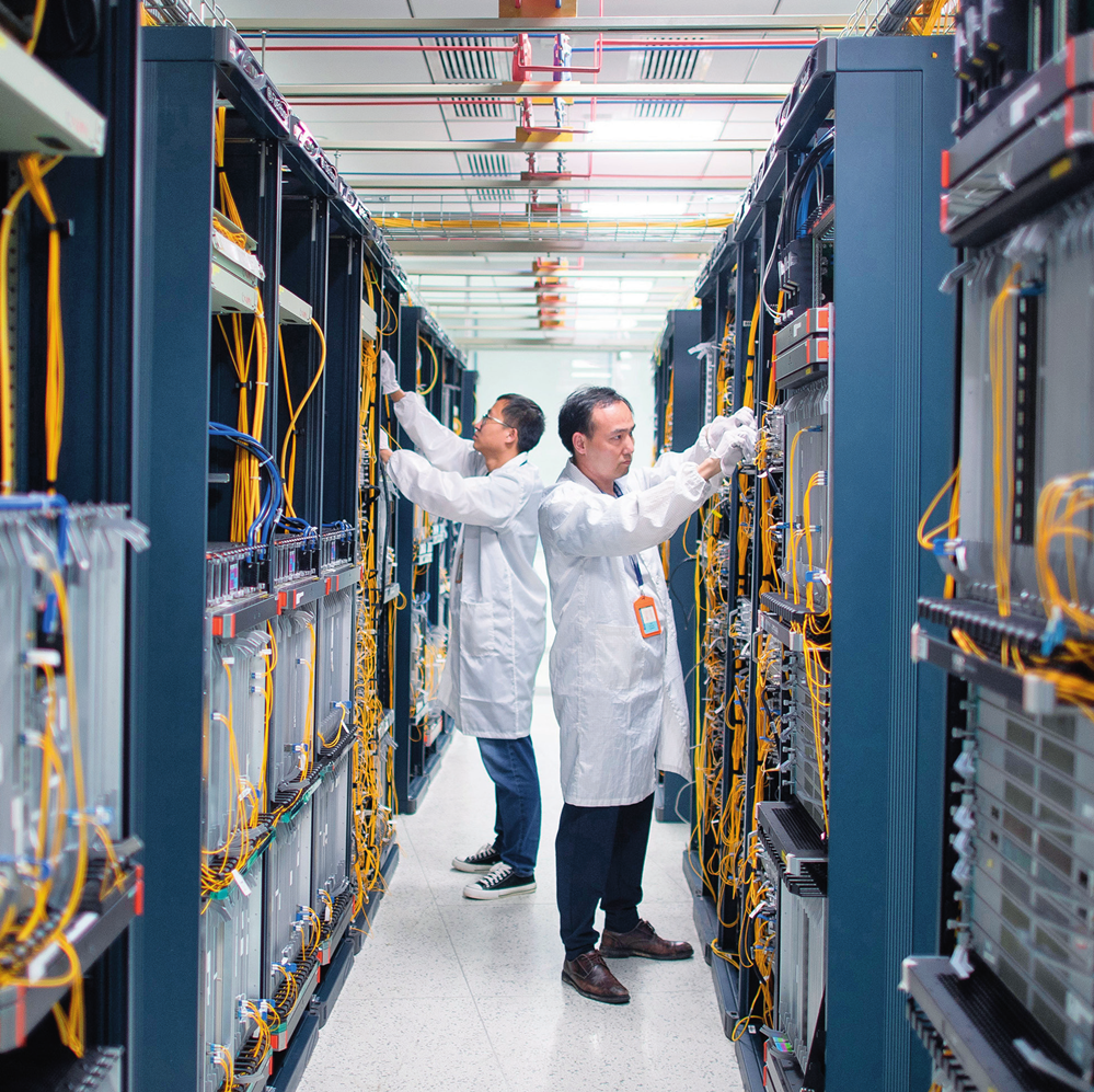 ▲武漢光迅科技股份有限公司生產(chǎn)車間內(nèi),技術(shù)人員在光模塊生產(chǎn)線作業(yè)