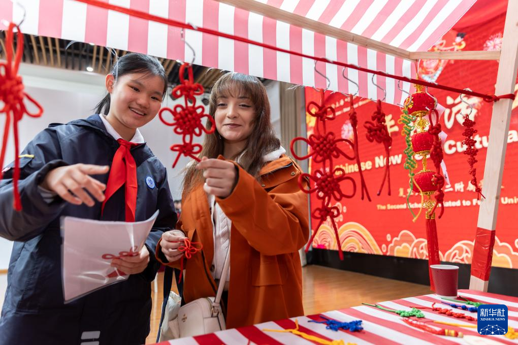 在復(fù)旦大學(xué)第二附屬學(xué)校,校民樂團(tuán)為遠(yuǎn)道而來的朋友準(zhǔn)備了《步步高》等中國(guó)傳統(tǒng)樂曲演奏表演。兩國(guó)學(xué)生還分為四組,圍成圓圈席地而坐做游戲,根據(jù)手中卡片的提示分享彼此的興趣愛好。兩國(guó)學(xué)生你一言、我一語(yǔ),在交流互動(dòng)中增進(jìn)友誼。游戲過后,學(xué)生們還體驗(yàn)了剪紙、編中國(guó)結(jié)、包春卷等傳統(tǒng)習(xí)俗。