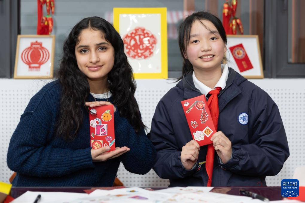 ??1月28日,美國(guó)馬斯卡廷中學(xué)學(xué)生(左)和復(fù)旦大學(xué)第二附屬學(xué)校學(xué)生展示互相送出的寫有寄語(yǔ)祝福的紅包。 新華社記者 王翔 攝
