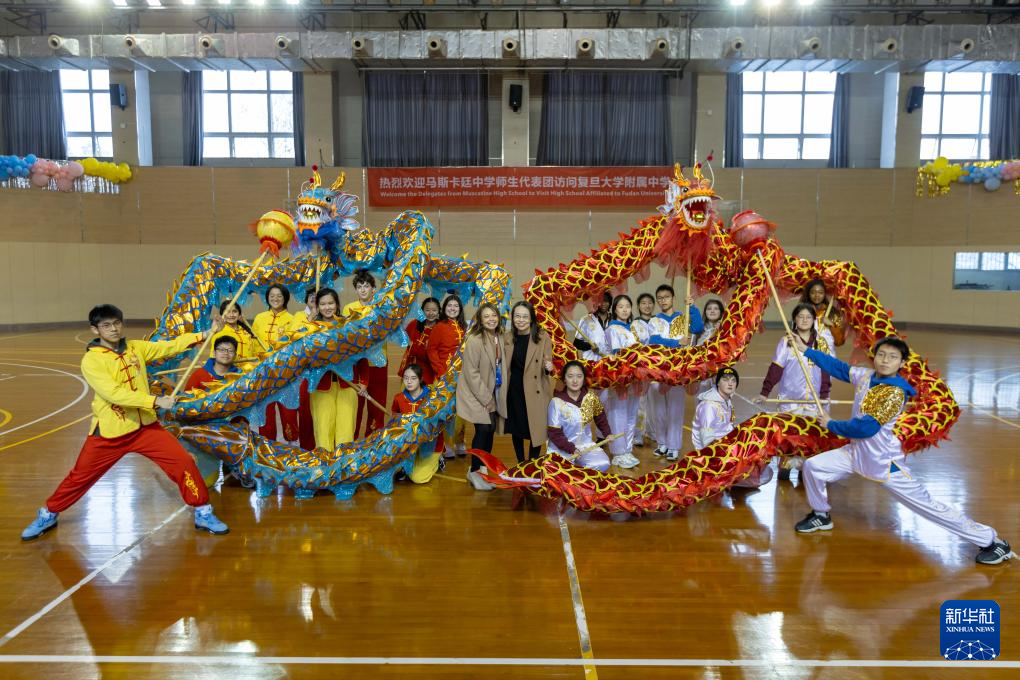 ??1月29日,在復(fù)旦大學(xué)附屬中學(xué),美國(guó)馬斯卡廷中學(xué)學(xué)生參加舞龍?bào)w驗(yàn)活動(dòng)。 新華社記者 王翔 攝