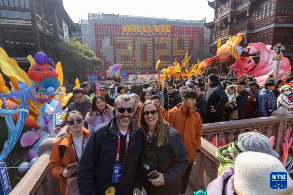 ??1月28日,美國(guó)馬斯卡廷師生在上海豫園九曲橋上參觀。 新華社記者 王翔 攝