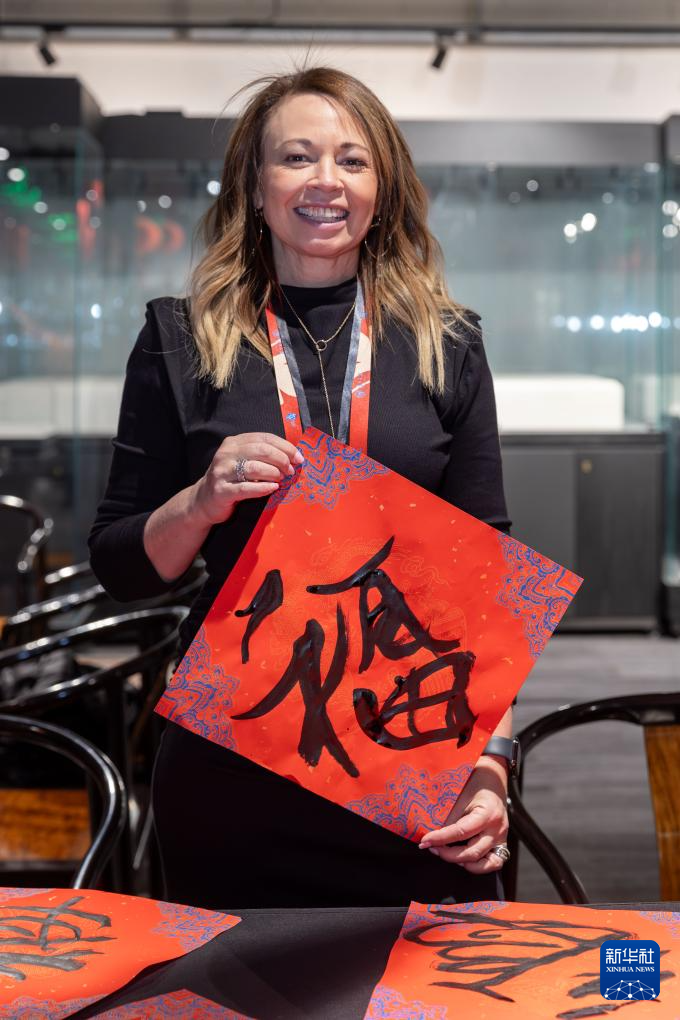 ??1月28日,在上海豫園舉行的民俗活動(dòng)上,美國(guó)馬斯卡廷初中校長(zhǎng)珍妮弗·李·弗里德利展示自己寫下的“?!弊?。 新華社記者 王翔 攝