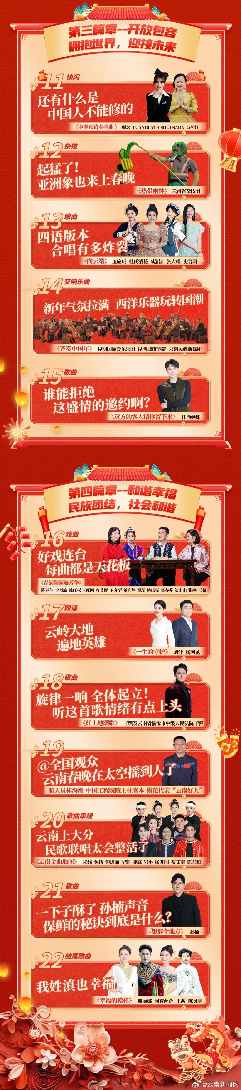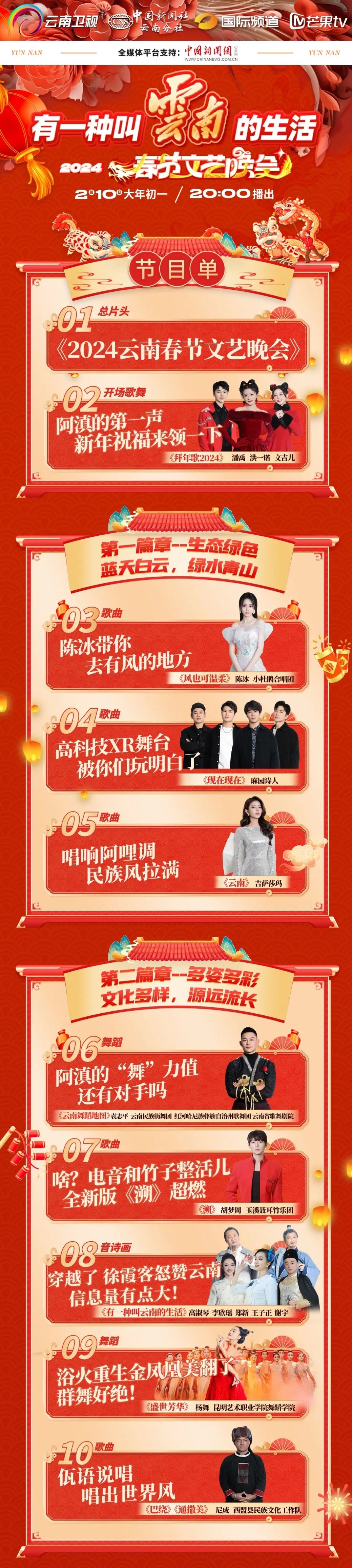 據(jù)導演組介紹,2024年云南春晚包括“生態(tài)綠色”“多姿多彩”“開放包容”“和諧幸?!彼膫€篇章,晚會時長100分鐘,共21個節(jié)目。本臺春晚以央地攜手、南南合作的形式開創(chuàng)了云南春晚新模式。晚會將于大年初一(2月10日)20時登陸云南衛(wèi)視、湖南廣播電視臺國際頻道,中國新聞網(wǎng)全媒體矩陣和芒果TV也將同步播出。