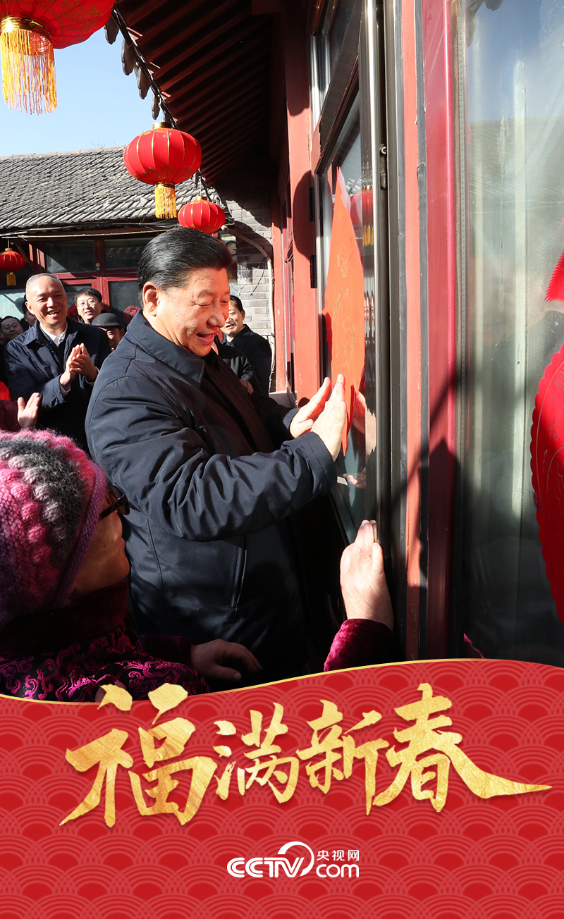 2019年2月1日,在北京前門(mén)東區(qū)草廠四條胡同32號(hào)小院,居民們熱情邀請(qǐng)前來(lái)拜年的總書(shū)記一起貼“福”字。總書(shū)記興致勃勃地拿起一幅紅底金色大“?!弊郑瑡故斓刭N在大門(mén)上。他對(duì)居民們說(shuō):希望咱們街坊鄰居們永遠(yuǎn)幸福。