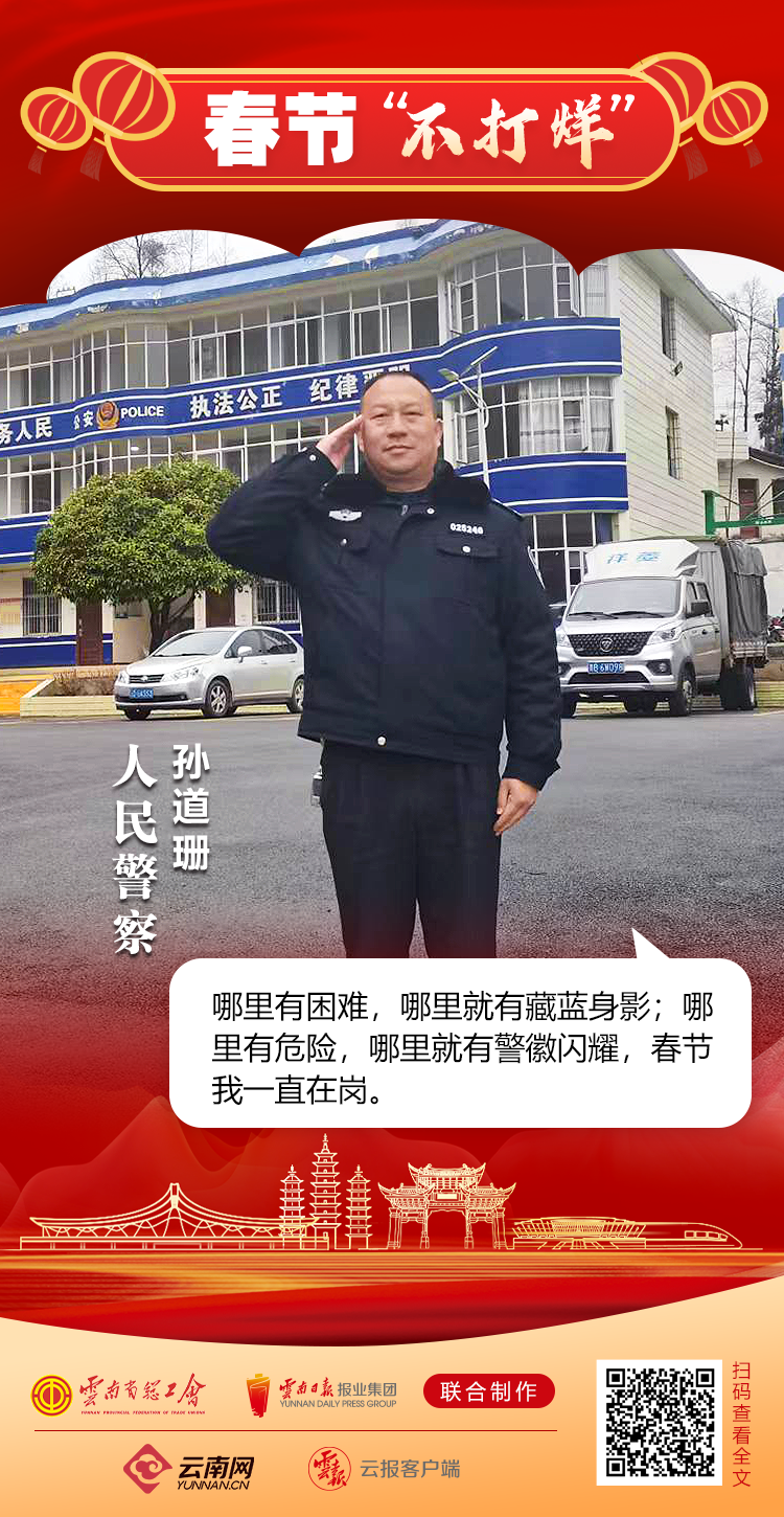 在云南省曲靖市宣威普立派出所,孫道珊度過了他連續(xù)4年的24小時春節(jié)值守,帶隊開展巡邏防控、景區(qū)安保、交通管理……對于工作20余年、扎根在基層一線的孫道珊而言,所有工作都顯得如此信手拈來。