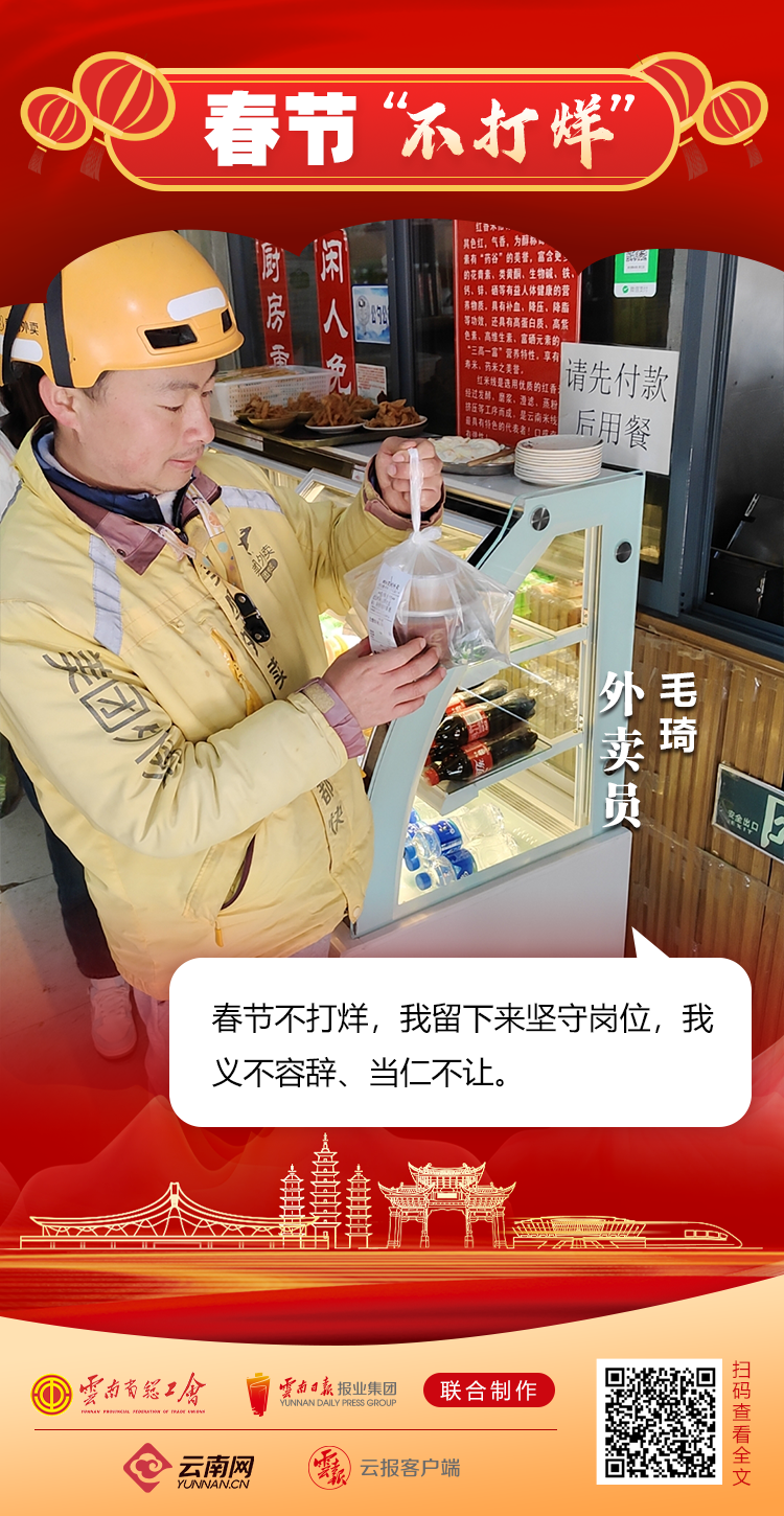 今年春節(jié)期間,玉溪市澄江市的外賣騎手們忙得不可開交,幾乎沒有時間回家與家人團聚。資深“外賣小哥”毛琦就是他們中的一員,這已經(jīng)是他連續(xù)第5年春節(jié)外賣配送“不打烊”了。
