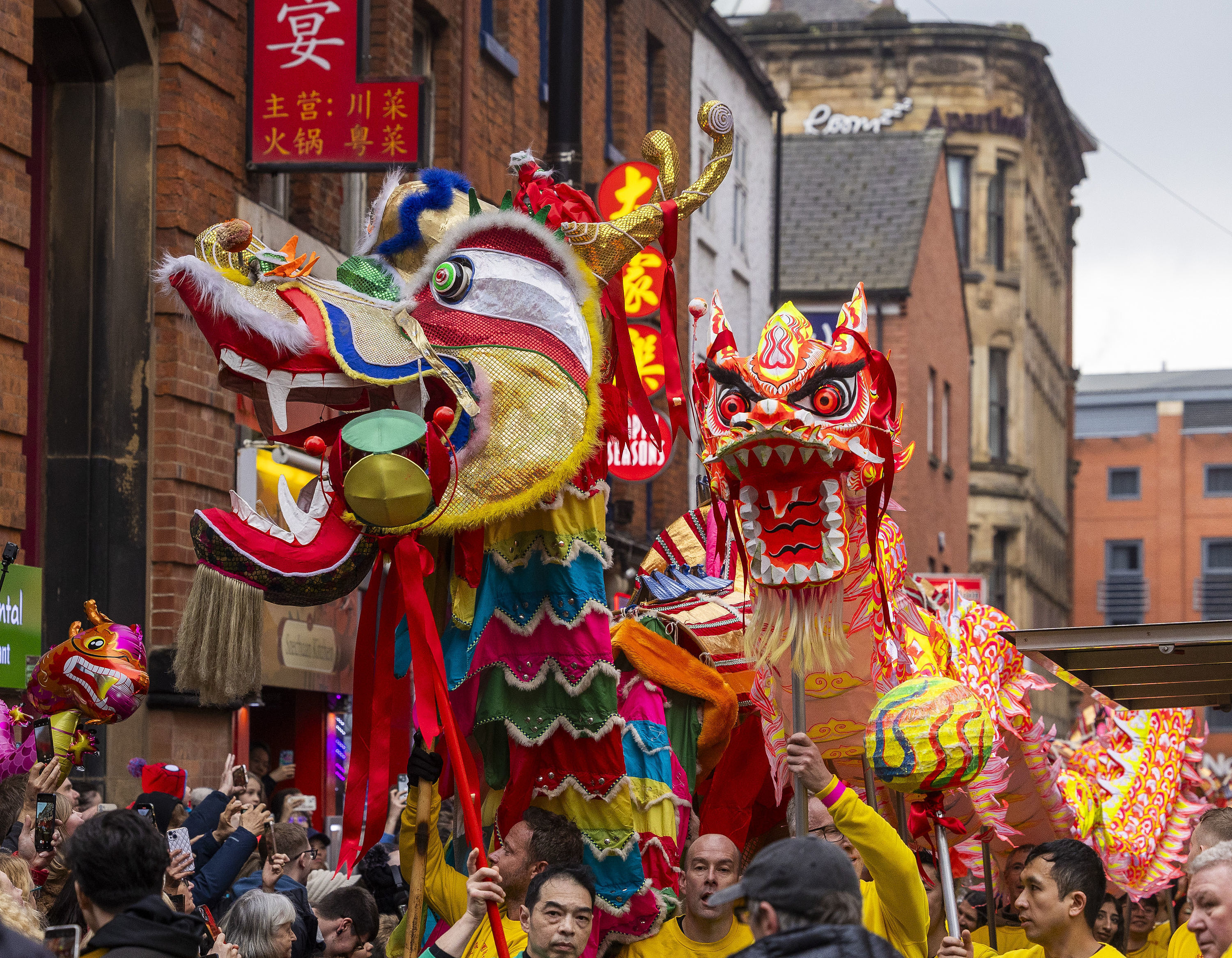 △ 當(dāng)?shù)貢r間2024年2月11日,英國曼徹斯特,表演者進(jìn)入中國城,參加中國農(nóng)歷龍年春節(jié)的慶祝活動。