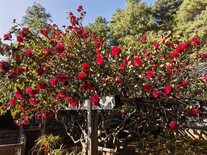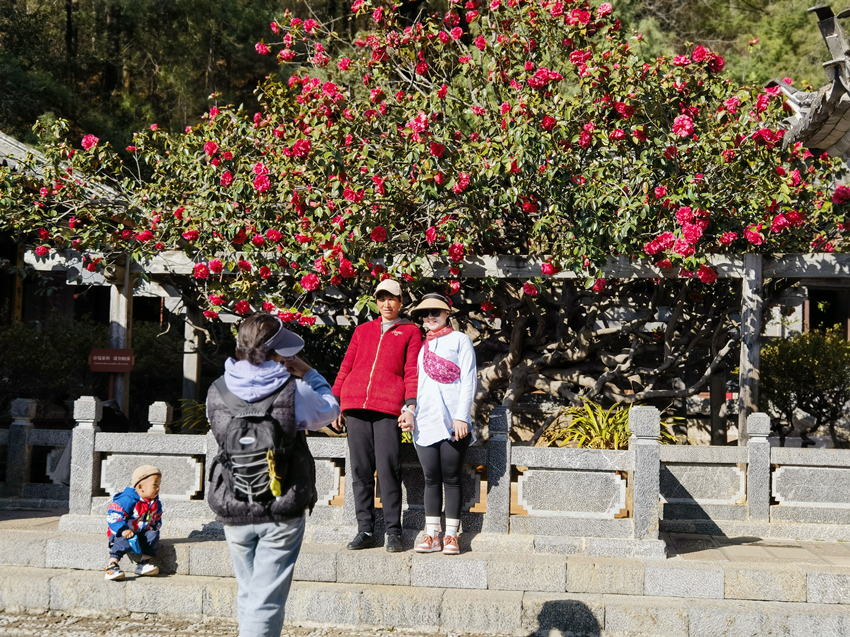 玉峰寺景區(qū)護(hù)花員趙立功告訴記者,一般山茶花在2月開放,但今年開得有些早,大寒過后便有花朵陸續(xù)綻放。入春以來,已經(jīng)吸引了不少市民、游客前來觀賞游玩?!斑@段時(shí)間,游客比較多,每天有六、七百人前來賞花。目前開到了第二批,第三批的時(shí)候就是農(nóng)歷二月初八納西三多節(jié)前后,將會(huì)迎來賞花的高潮。以往年會(huì)開到五月初,但今年可能只會(huì)開到四月底了。”