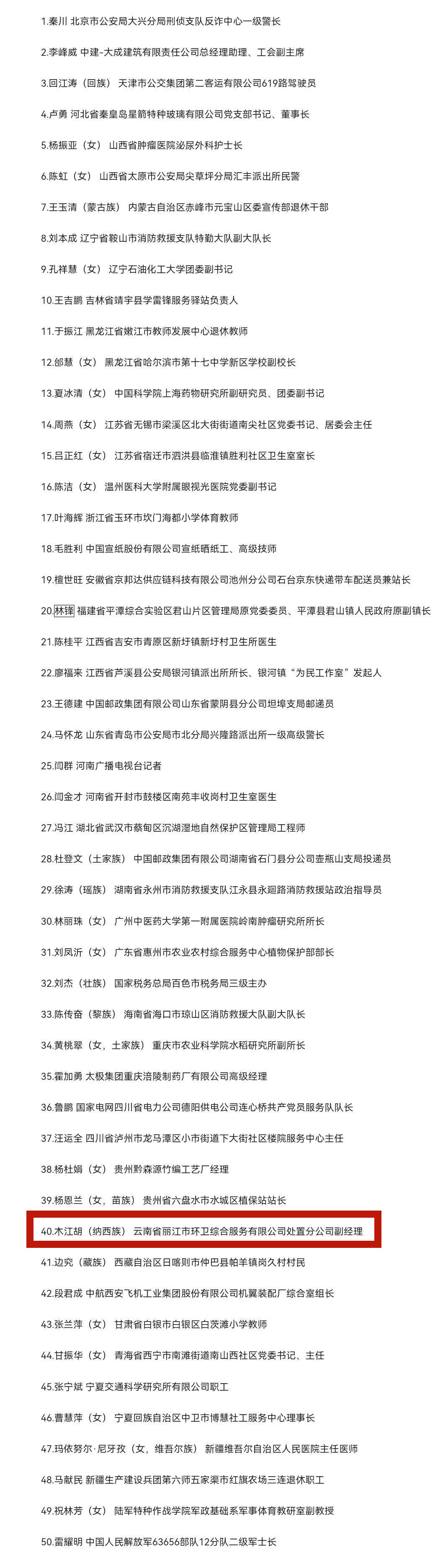 為持續(xù)推動(dòng)學(xué)雷鋒活動(dòng)深入開展,近日,中宣部宣教局公示了第九批全國學(xué)雷鋒活動(dòng)示范點(diǎn)和崗位學(xué)雷鋒標(biāo)兵擬命名對象名單。其中,麗江市環(huán)衛(wèi)綜合服務(wù)有限公司處置分公司副經(jīng)理木江胡名列其中。