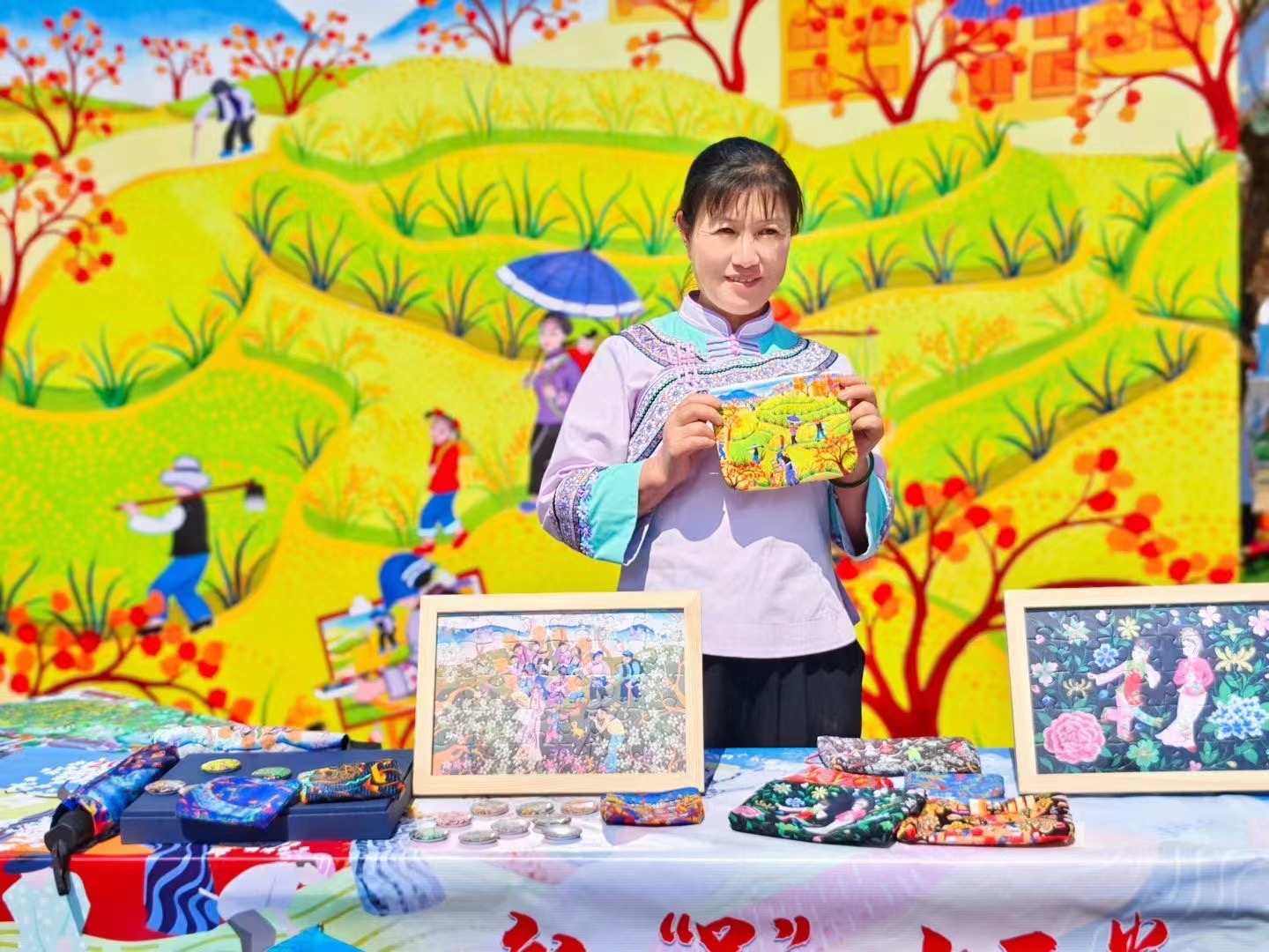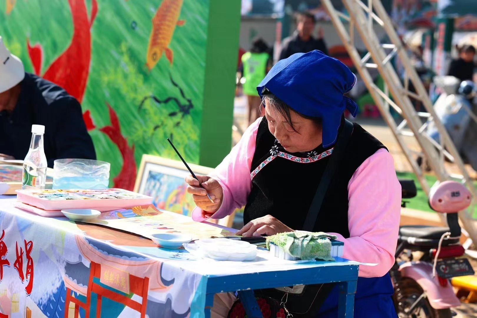 主會場現(xiàn)場,來自呈貢區(qū)的12名民間繪畫家們用鮮艷的色彩、細膩的筆觸、飽滿的構(gòu)圖呈現(xiàn)出田間勞作的農(nóng)民、豐收的喜悅、農(nóng)村特有的風情,50余副展現(xiàn)呈貢悠久歷史文化和萬溪梨鎮(zhèn)發(fā)展變遷的和美畫作躍然紙上。