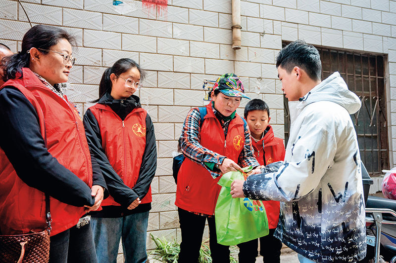 在昆明市五華區(qū)黃土坡小屯老村,“昆明之美”公益團隊成員給面臨輟學風險的男孩(右一)送愛心物資(2024年2月5日攝) 胡超攝/本刊