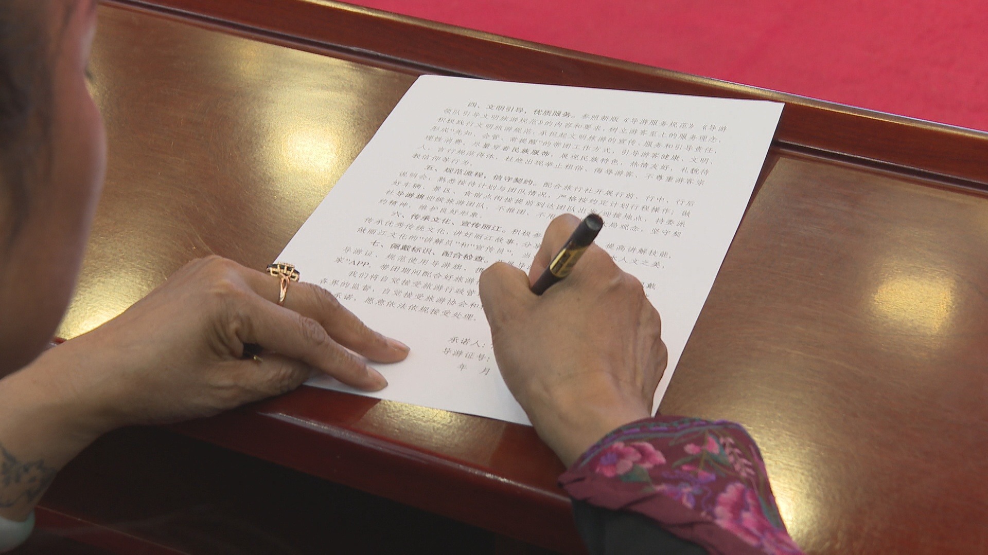 導(dǎo)游現(xiàn)場簽訂“麗江導(dǎo)游優(yōu)質(zhì)服務(wù)承諾書”。(張麗瑤 攝)