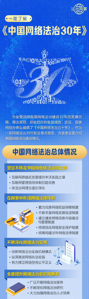 全面回顧我國網(wǎng)絡(luò)法治建設(shè)30年的發(fā)展歷程、理念原則、經(jīng)驗(yàn)啟示和實(shí)踐成效,近日,國家網(wǎng)信辦牽頭編撰了《中國網(wǎng)絡(luò)法治三十年》。作為一部網(wǎng)絡(luò)法治30年的全景式報(bào)告,為讀者全面介紹我國網(wǎng)絡(luò)法治建設(shè)總體情況。