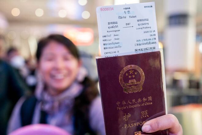 2月14日,在云南昆明,乘坐中老鐵路國際旅客列車前往老撾的游客展示購買到的車票。新華社記者 胡超 攝
