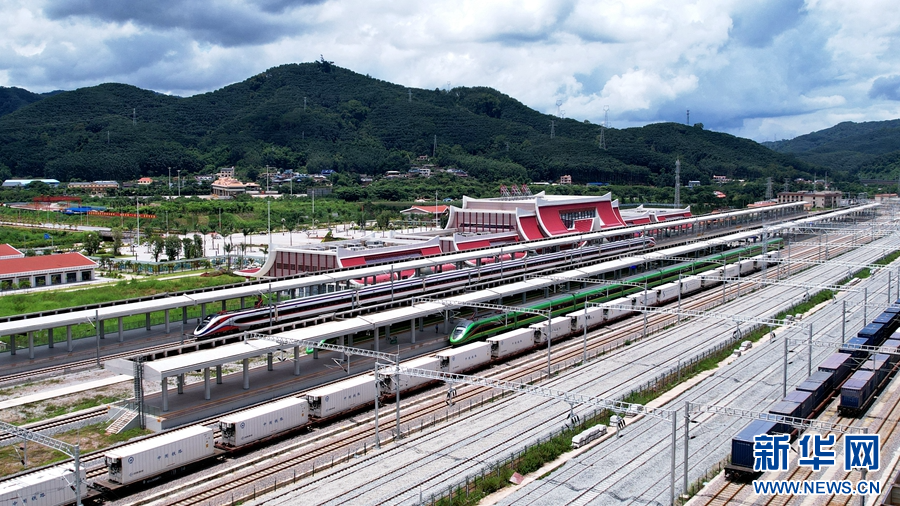 中老鐵路磨憨站內(nèi),同時(shí)??恐涣小皬?fù)興號(hào)”動(dòng)車組列車和一列“瀾滄號(hào)”動(dòng)車組列車(資料圖)。新華網(wǎng)發(fā)(殷學(xué)合 攝)