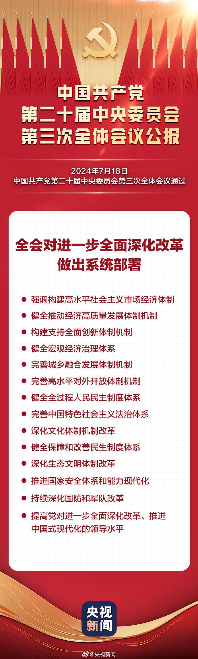 中國共產(chǎn)黨第二十屆中央委員會第三次全體會議于2024年7月15日至18日在北京舉行,全會對進(jìn)一步全面深化改革做出系統(tǒng)部署,強(qiáng)調(diào)構(gòu)建高水平社會主義市場經(jīng)濟(jì)體制,健全推動經(jīng)濟(jì)高質(zhì)量發(fā)展體制機(jī)制,構(gòu)建支持全面創(chuàng)新體制機(jī)制,健全宏觀經(jīng)濟(jì)治理體系,完善城鄉(xiāng)融合發(fā)展體制機(jī)制,完善高水平對外開放體制機(jī)制,健全全過程人民民主制度體系,完善中國特色社會主義法治體系,深化文化體制機(jī)制改革,健全保障和改善民生制度體系,深化生態(tài)文明體制改革,推進(jìn)國家安全體系和能力現(xiàn)代化,持續(xù)深化國防和軍隊(duì)改革,提高黨對進(jìn)一步全面深化改革、推進(jìn)中國式現(xiàn)代化的領(lǐng)導(dǎo)水平。