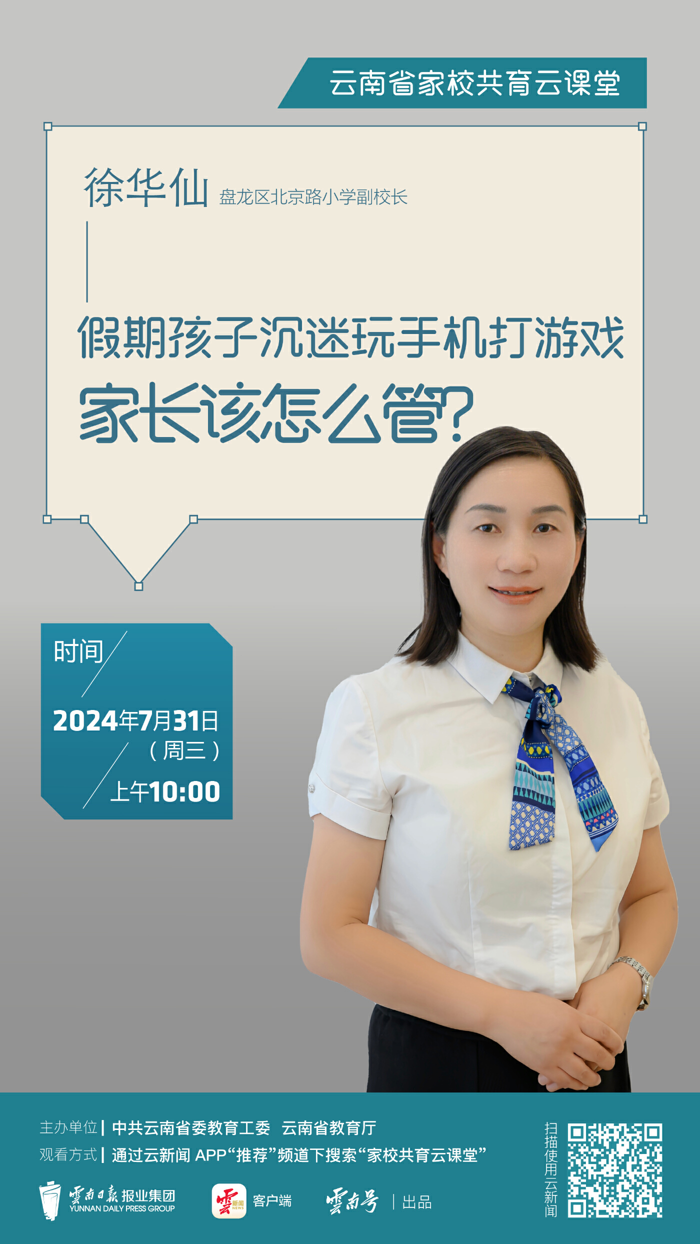 暑期放假,不少家長(zhǎng)正在為孩子沉迷玩手機(jī)、打游戲的問題而苦惱,7月31日上午10:00,云南家校共育云課堂第七期——《假期孩子沉迷玩手機(jī)打游戲,家長(zhǎng)該怎么管?》在云新聞客戶端上線,本期邀請(qǐng)昆明市盤龍區(qū)北京路小學(xué)副校長(zhǎng)徐華仙老師,與大家聊聊假期孩子沉迷玩手機(jī)、打游戲,父母怎么辦?一起來看看吧!