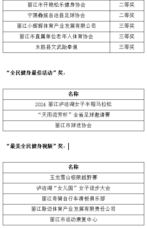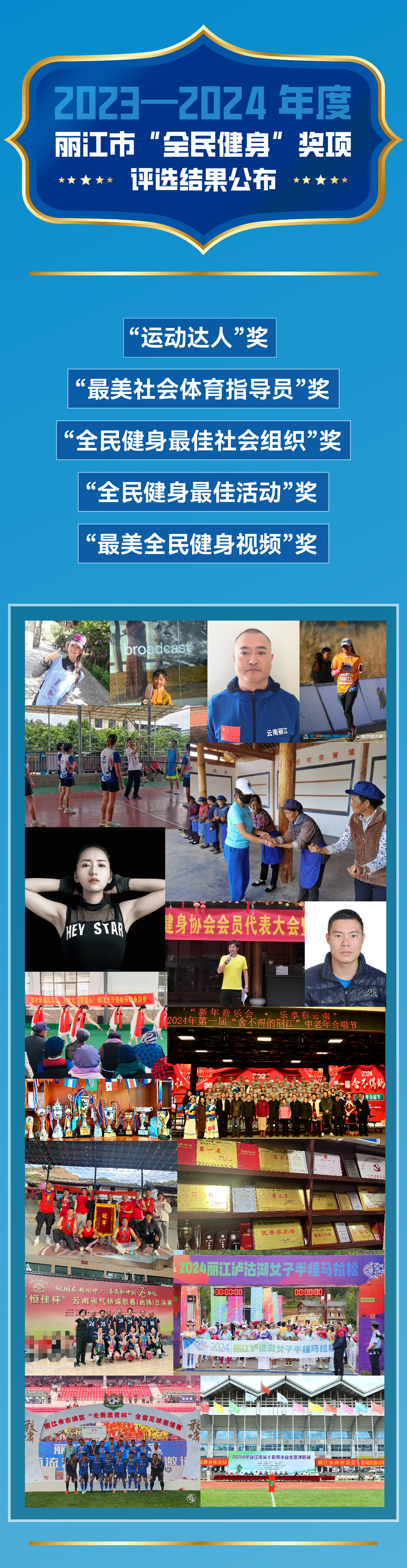 在這個(gè)充滿活力與激情的季節(jié)里,我們共同見證了“全民健身”的熱潮。經(jīng)過層層篩選和嚴(yán)格評審,2023—2024 年度麗江市“全民健身” 獎(jiǎng)項(xiàng),關(guān)于“運(yùn)動(dòng)達(dá)人”、“最美社會(huì)體育指導(dǎo)員”、“全民健身最佳社會(huì)組織”、全民健身最佳活動(dòng)、“最美全民健身視頻”獎(jiǎng)的評選結(jié)果終于揭曉!