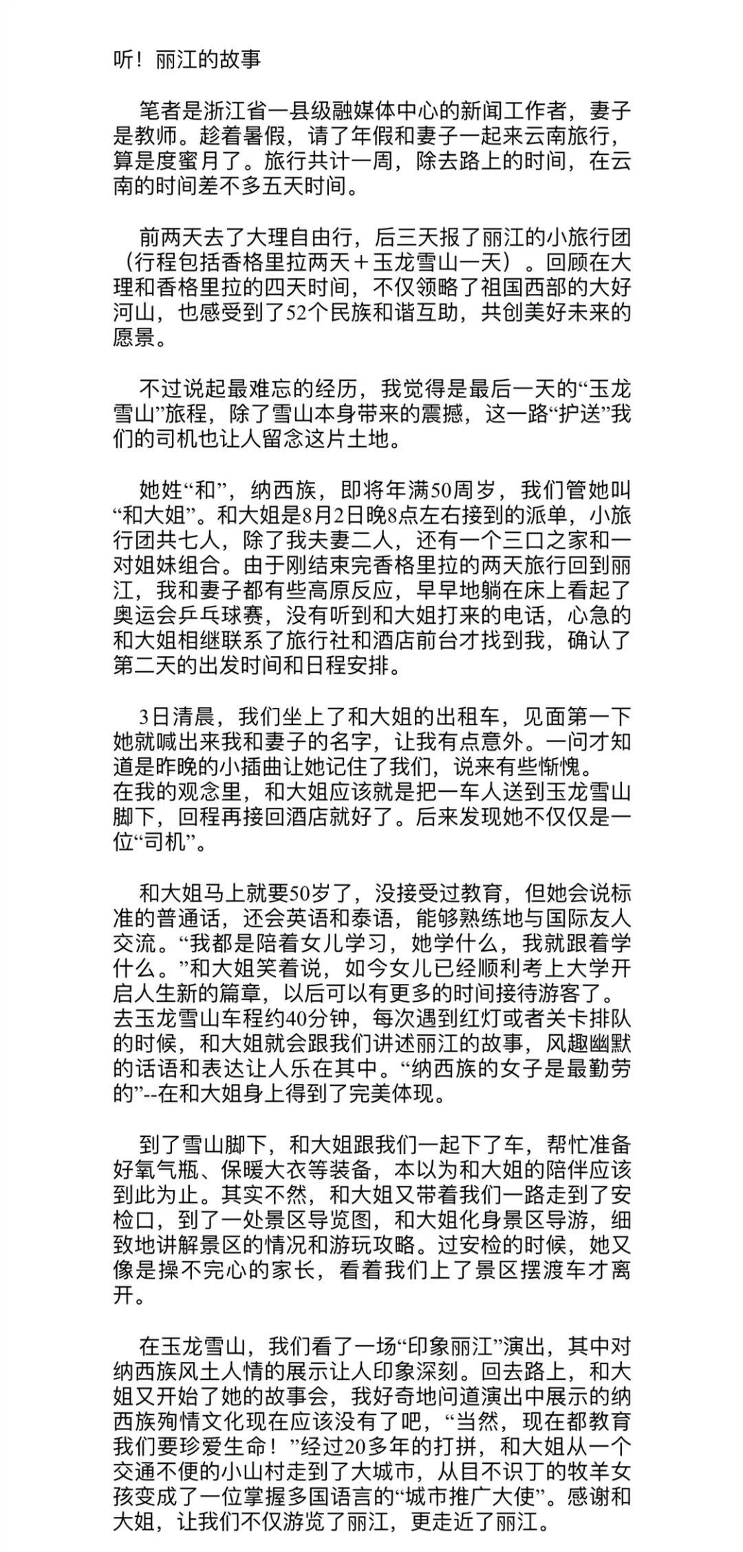 浙江游客王家浩在麗江融媒APP“連心橋”發(fā)文。(截圖)浙江游客王家浩:司機(jī)和大姐的細(xì)心護(hù)送,讓我留戀這片土地“整趟云南之旅差不多一個(gè)星期,領(lǐng)略到祖國西部的大好河山。不過最難忘的經(jīng)歷,就是最后一天的玉龍雪山旅程,除了雪山本身帶來的震撼,這一路‘護(hù)送’我們的司機(jī)和大姐也讓我留戀這片土地?!?王家浩說。