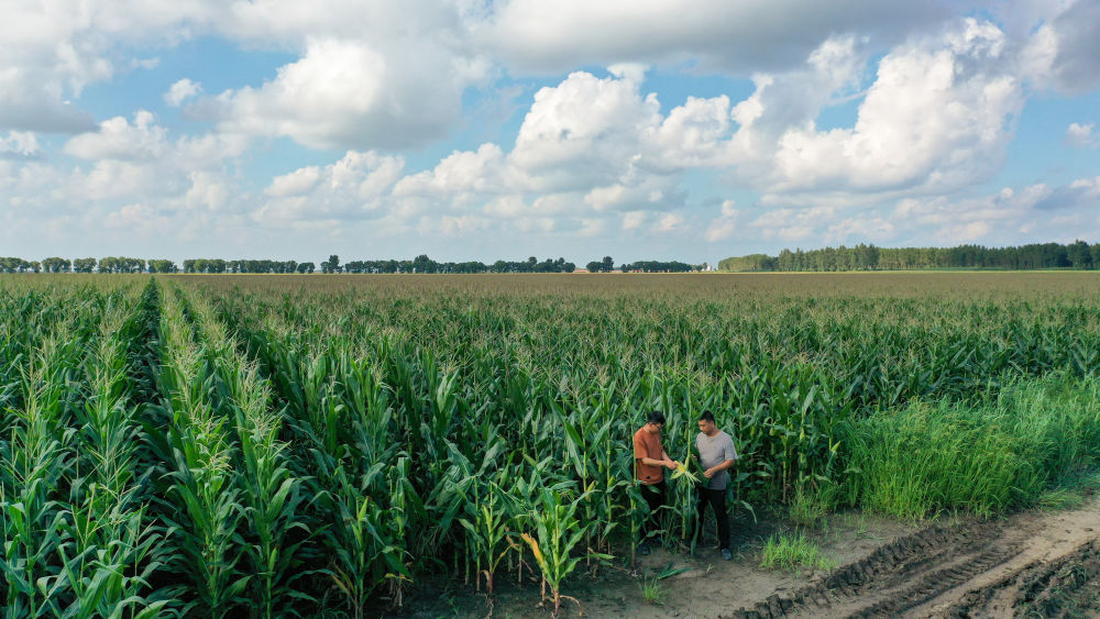2024年8月8日,在吉林省梨樹縣孤家子鎮(zhèn)兩家子村,當?shù)剞r(nóng)業(yè)發(fā)展服務(wù)站高級農(nóng)藝師蘭雨壯(左)與四平市強盛農(nóng)機農(nóng)民專業(yè)合作社負責人查看玉米長勢(無人機照片)。多年來,地處世界“黃金玉米帶”的全國產(chǎn)糧大縣吉林省梨樹縣,強化科技在農(nóng)業(yè)生產(chǎn)中的支撐作用,持續(xù)提升糧食和重要農(nóng)產(chǎn)品穩(wěn)產(chǎn)保供能力。