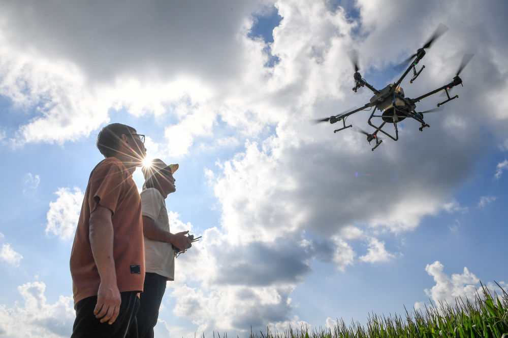 2024年8月8日,在吉林省梨樹縣孤家子鎮(zhèn),當?shù)剞r(nóng)業(yè)發(fā)展服務(wù)站高級農(nóng)藝師蘭雨壯(左)查看無人機作業(yè)情況。