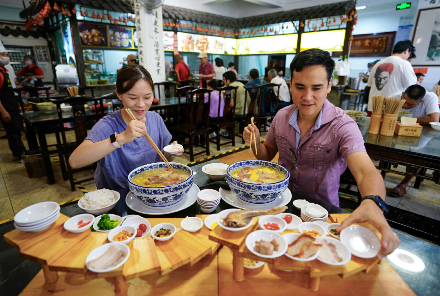 來自南美洲國家秘魯?shù)鸟R賽(右)和朋友在蒙自一家過橋米線店內(nèi)品嘗過橋米線。新華社記者 陳欣波 攝