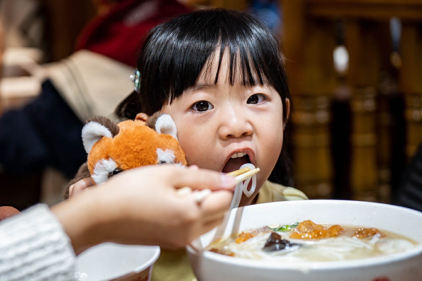 從江西南昌到昆明旅游的小朋友在昆明市寶善街品嘗過橋米線。新華社記者 胡超 攝
