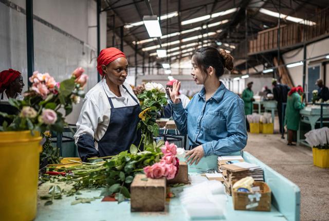 2024年5月18日,湖南璽悅國際貿(mào)易有限公司負(fù)責(zé)人黃梓楠(右)在肯尼亞納紐基的坦布濟(jì)花卉農(nóng)場挑選鮮花。中國政府2021年11月宣布為非洲農(nóng)產(chǎn)品輸華建立“綠色通道”,縮短檢驗(yàn)檢疫時(shí)間,擴(kuò)大關(guān)稅豁免,為肯尼亞鮮花及非洲各國的牛油果、柑橘、菠蘿等特色農(nóng)產(chǎn)品打開了銷路。