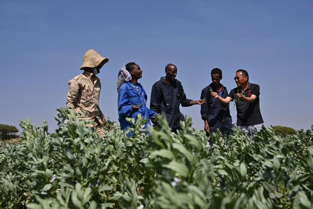 2023年9月27日,在位于厄立特里亞阿斯馬拉的農(nóng)業(yè)技術(shù)援助項(xiàng)目示范地,中國援厄第三期高級(jí)農(nóng)業(yè)專家組豆類作物專家劉運(yùn)民(右一)與當(dāng)?shù)剞r(nóng)戶交流。為推動(dòng)厄立特里亞農(nóng)業(yè)產(chǎn)業(yè)發(fā)展,中國農(nóng)業(yè)農(nóng)村部已派出多批專家在厄立特里亞開展涉及豆類作物、果樹園藝、油料等領(lǐng)域的技術(shù)援助工作。
