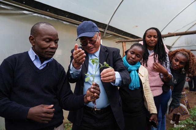 2023年9月18日,在肯尼亞納庫魯郡舉辦的中非農(nóng)業(yè)發(fā)展和減貧示范村番茄生產(chǎn)培訓(xùn)班上,來自中國的農(nóng)學(xué)教授劉高瓊(左二)為肯方學(xué)員指導(dǎo)農(nóng)業(yè)技術(shù)。多年來,中國農(nóng)業(yè)專家在當(dāng)?shù)亻_展了知識(shí)培訓(xùn)、技術(shù)指導(dǎo)和農(nóng)業(yè)設(shè)施修繕等工作,有效助力中國先進(jìn)的農(nóng)業(yè)技術(shù)在納庫魯?shù)貐^(qū)的示范推廣,幫助農(nóng)民實(shí)現(xiàn)增收減貧的目標(biāo)。