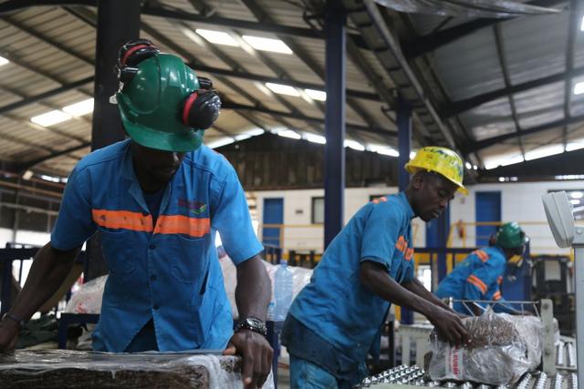 2024年6月10日,在科特迪瓦南部城鎮(zhèn)達(dá)布郊區(qū),工人們?cè)诿捞m橡膠加工廠對(duì)成品橡膠進(jìn)行打包。中國加工廠幫助科特迪瓦橡膠增加產(chǎn)品附加值,提高膠農(nóng)收入。