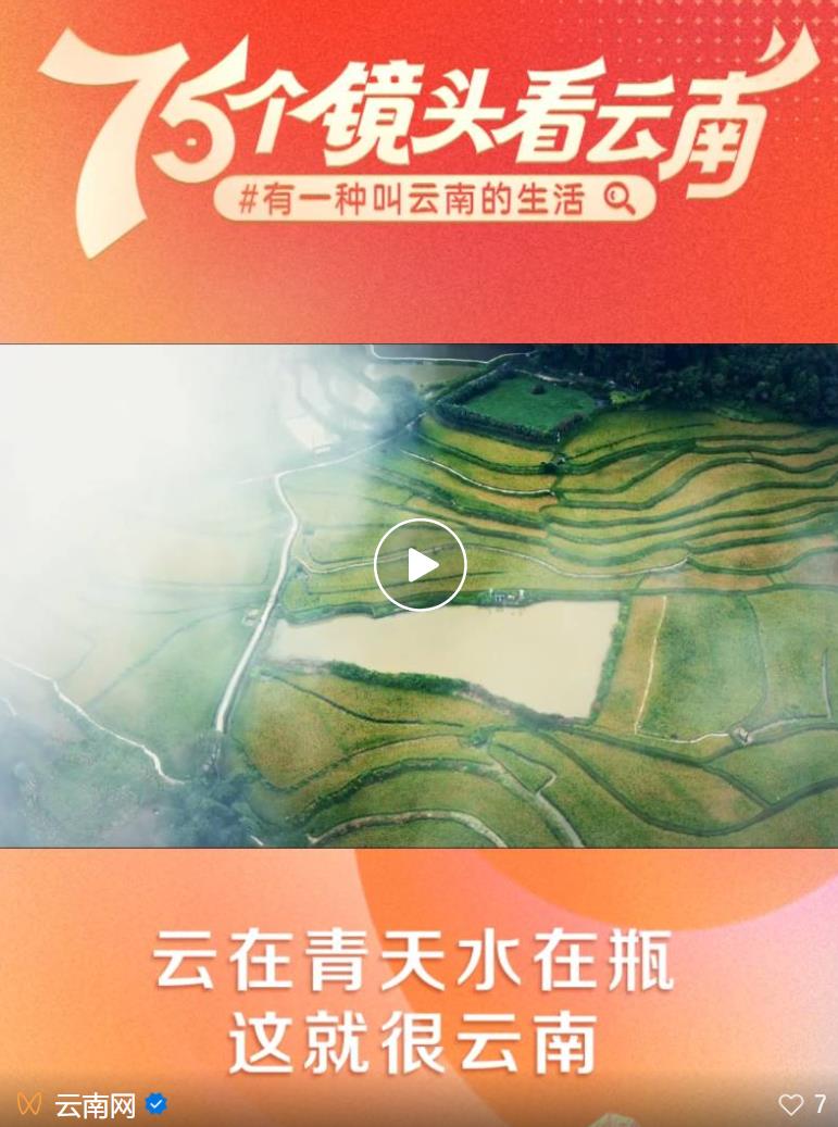 一言不合就打跳,一年四季在過(guò)節(jié),我們?cè)颇虾芸蓯?ài);紅嘴鷗每年準(zhǔn)時(shí)光顧,大象在這里愉快逛吃,我們?cè)颇虾芎迷冢桓哞F聯(lián)接國(guó)內(nèi)外,144個(gè)小時(shí)過(guò)境免簽,我們?cè)颇蟻?lái)了還想來(lái)……這些動(dòng)人的片段,都是“有一種叫云南的生活”的精彩呈現(xiàn),是我們獻(xiàn)給新中國(guó)最好的生日禮物。 為獻(xiàn)禮中華人民共和國(guó)成立75周年,云南網(wǎng)聯(lián)合云南發(fā)布、“學(xué)習(xí)強(qiáng)國(guó)”云南學(xué)習(xí)平臺(tái)共同策劃推出“喜迎新中國(guó)成立75周年 75個(gè)鏡頭帶你看云南”融媒專(zhuān)欄,在7月18日至9月30日期間,一天一推,連續(xù)推出75條短視頻,聚焦最具云南味兒的山、水、風(fēng)、物、人,用細(xì)膩鏡頭、新穎表達(dá)、明快節(jié)奏、酷炫畫(huà)面,再現(xiàn)最奇特的山水風(fēng)光、最地道的民族風(fēng)情、最深厚的文化底蘊(yùn)、最絢麗的民間藝術(shù)、最原汁原味的美食,全方位展現(xiàn)“有一種叫云南的生活”。今天,請(qǐng)看第五十一期——《云在青天水在瓶,這就很云南》。 #今日話題# 你最喜歡哪個(gè)季節(jié)的哈尼梯田? 歡迎來(lái)評(píng)論區(qū)聊聊~ 統(tǒng)籌:羅蓉嬋 曹璐 唐莉娜 李星佺 張碧玉 李潔 制片:郭凱 李赟靜 林云冬 趙娟 趙家琦 張成 吳珺 姬祥虎 包濤 楊昊 沐旭 趙瑋 何沐 視頻制作:徐樹(shù)濤 配音:郭凱 編輯:段杉杉 設(shè)計(jì):蔡陳晨 支持單位:中國(guó)互聯(lián)網(wǎng)發(fā)展基金會(huì)、中國(guó)互聯(lián)網(wǎng)發(fā)展基金會(huì)中國(guó)正能量網(wǎng)絡(luò)傳播專(zhuān)項(xiàng)基金資助支持