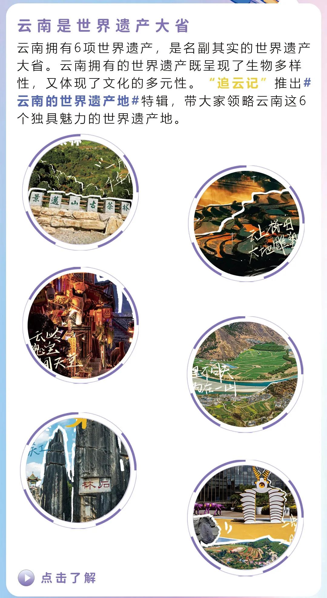 “追云記”是由云南省文化館與云南廣播電視臺聯(lián)合創(chuàng)立的一檔以新媒體創(chuàng)新方式、對云南文化和旅游進(jìn)行多維立體的宣傳推廣為主的融媒體欄目,挖掘云南有趣的人和事物,以新奇、奇特的角度呈現(xiàn)更加有趣的云南特色。用新視角展示云南生態(tài)、旅游和民族文化資源的豐富多樣性,讓更多游客感受云南人文風(fēng)物,開啟七彩云南的心動旅程。