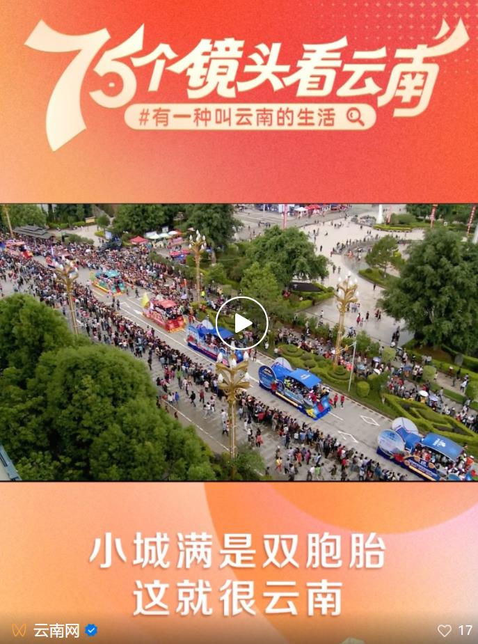 為獻(xiàn)禮中華人民共和國成立75周年,云南網(wǎng)聯(lián)合云南發(fā)布、“學(xué)習(xí)強國”云南學(xué)習(xí)平臺共同策劃推出“喜迎新中國成立75周年 75個鏡頭帶你看云南”融媒專欄,在7月18日至9月30日期間,一天一推,連續(xù)推出75條短視頻,聚焦最具云南味兒的山、水、風(fēng)、物、人,用細(xì)膩鏡頭、新穎表達(dá)、明快節(jié)奏、酷炫畫面,再現(xiàn)最奇特的山水風(fēng)光、最地道的民族風(fēng)情、最深厚的文化底蘊、最絢麗的民間藝術(shù)、最原汁原味的美食,全方位展現(xiàn)“有一種叫云南的生活”。今天,請看第六十四期——《小城滿是雙胞胎,這就很云南》。