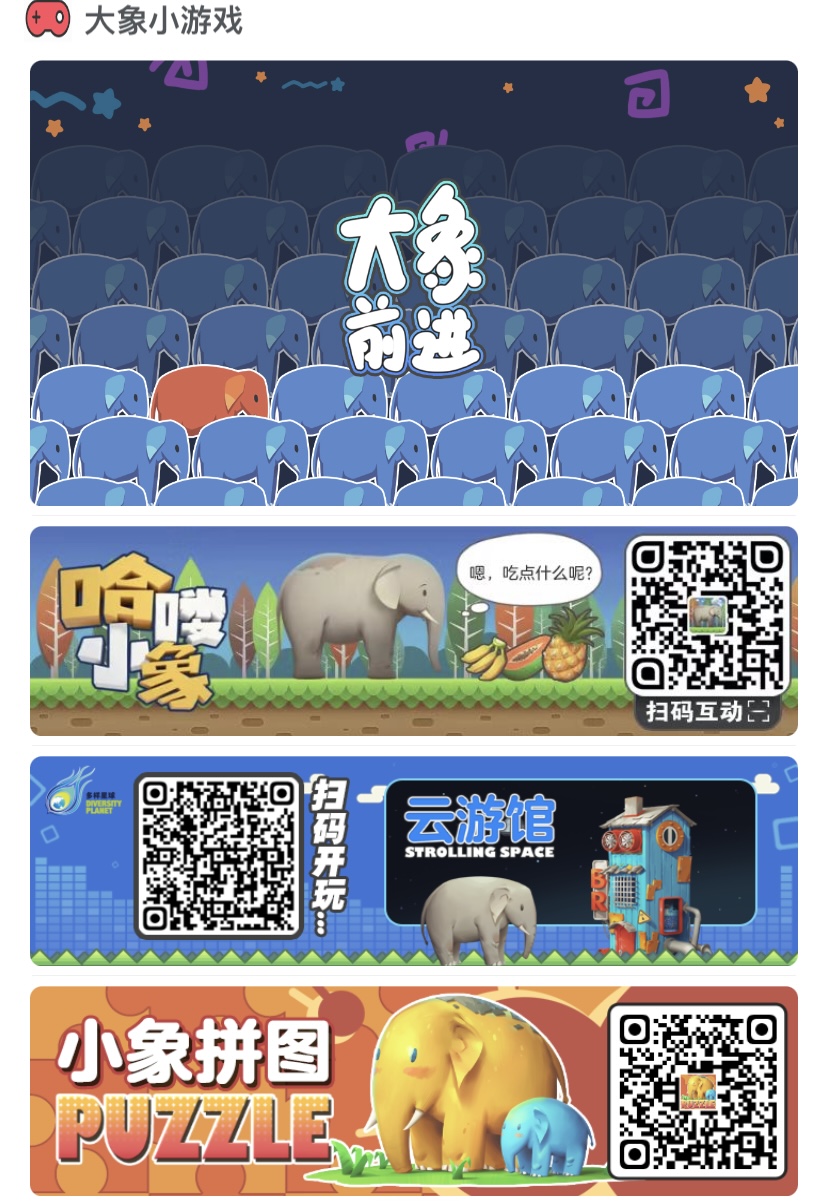 大象小游戲——上線四款亞洲象主題趣味互動游戲,“哈嘍小象”“云游館”“小象拼圖”“大象前進”,其中“大象前進”為針對此項目設計的新游戲。通過游戲的互動環(huán)節(jié),讓公眾更直觀地了解亞洲象的生活習性、行為特征以及它們在生態(tài)系統(tǒng)中的重要作用,激發(fā)公眾對亞洲象保護的興趣和熱情,提升亞洲象保護工作的關(guān)注度,寓教于樂在游戲中守護“人象和諧”。