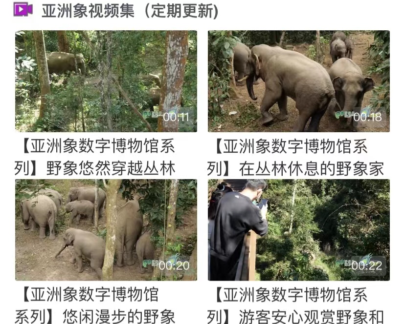 亞洲象視頻集、野象谷景區(qū)圖集、大象小游戲——“七彩云端”APP亞洲象專區(qū)推出多段珍貴「亞洲象視頻」可以看到小象和象媽媽在水中嬉戲、大象家族在叢林漫步休憩;游客在棧道近距離觀象和拍照等珍貴影像資源。