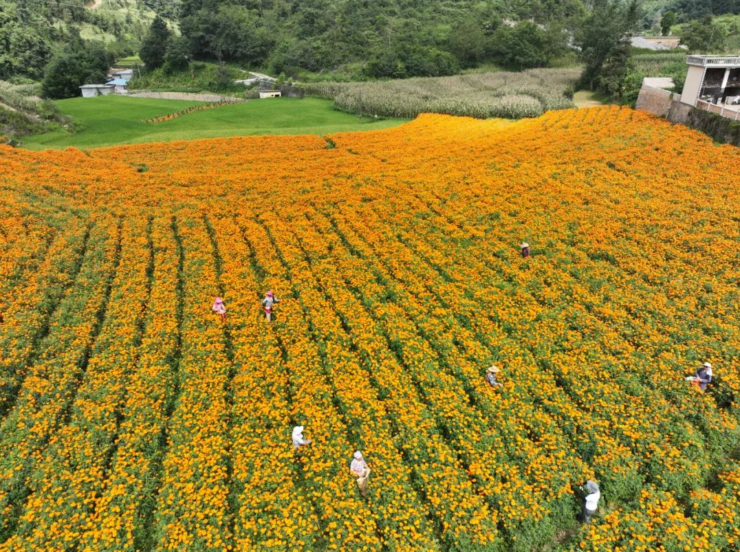 在文山壯族苗族自治州富寧縣田蓬鎮(zhèn),豐收的笑容與金色的花朵交相輝映,1300余畝萬壽菊簇擁綻放,宛如金色地毯鋪遍田間,花農(nóng)們在田間辛勤勞動,呈現(xiàn)出一幅美不勝收的美好“豐”景。