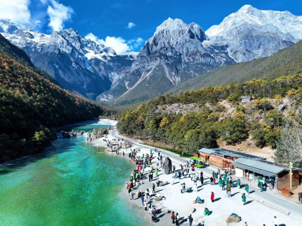 秋末的天氣云淡風(fēng)輕,玉龍雪山白雪皚皚,半山森林層林盡染,藍(lán)月湖如同一塊巨大的藍(lán)寶石靜臥在山谷,清澈的冰川融水淙淙流過,如詩如畫的風(fēng)景令人陶醉。嘉賓團(tuán)一行在湖邊棧道上緩緩前行,一路走一路拍,“太漂亮了,這回朋友圈可以好好炫一下了。”大家打趣說。