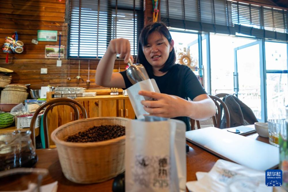 10月30日,普洱市孟連傣族拉祜族佤族自治縣橋安咖啡莊園工作人員賴怡君在包裝烘焙的咖啡豆。新華社記者 陳欣波 攝