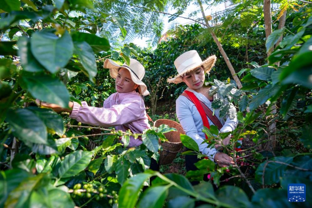 10月30日,在普洱市孟連傣族拉祜族佤族自治縣橋安咖啡莊園,兩名咖農在采摘成熟的咖啡鮮果。新華社記者 陳欣波 攝