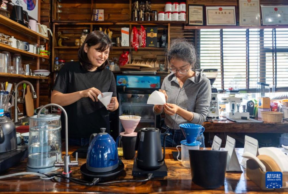10月30日,普洱市孟連傣族拉祜族佤族自治縣橋安咖啡莊園工作人員賴怡君(左)在指導一名游客制作手沖咖啡。新華社記者 陳欣波 攝